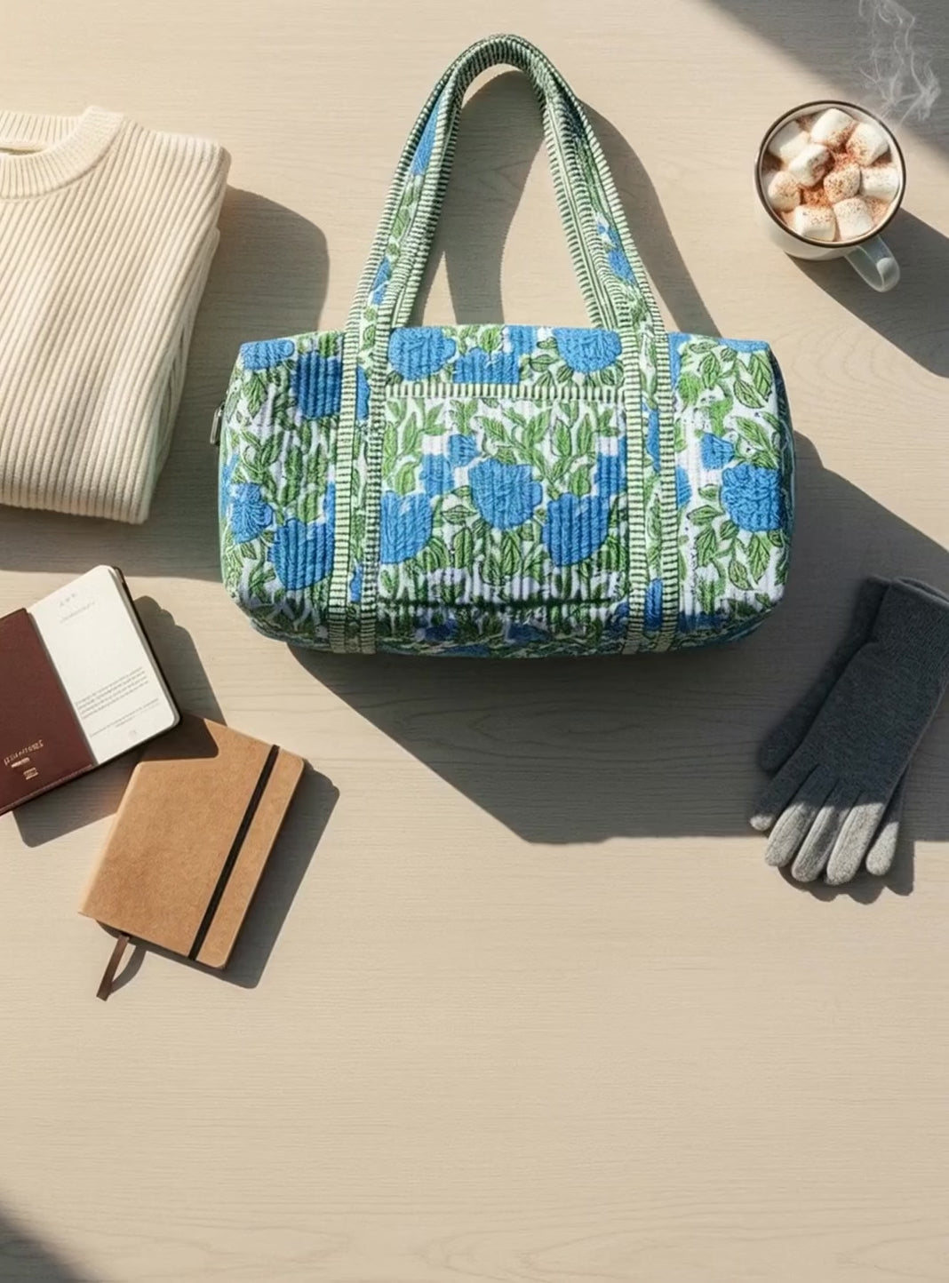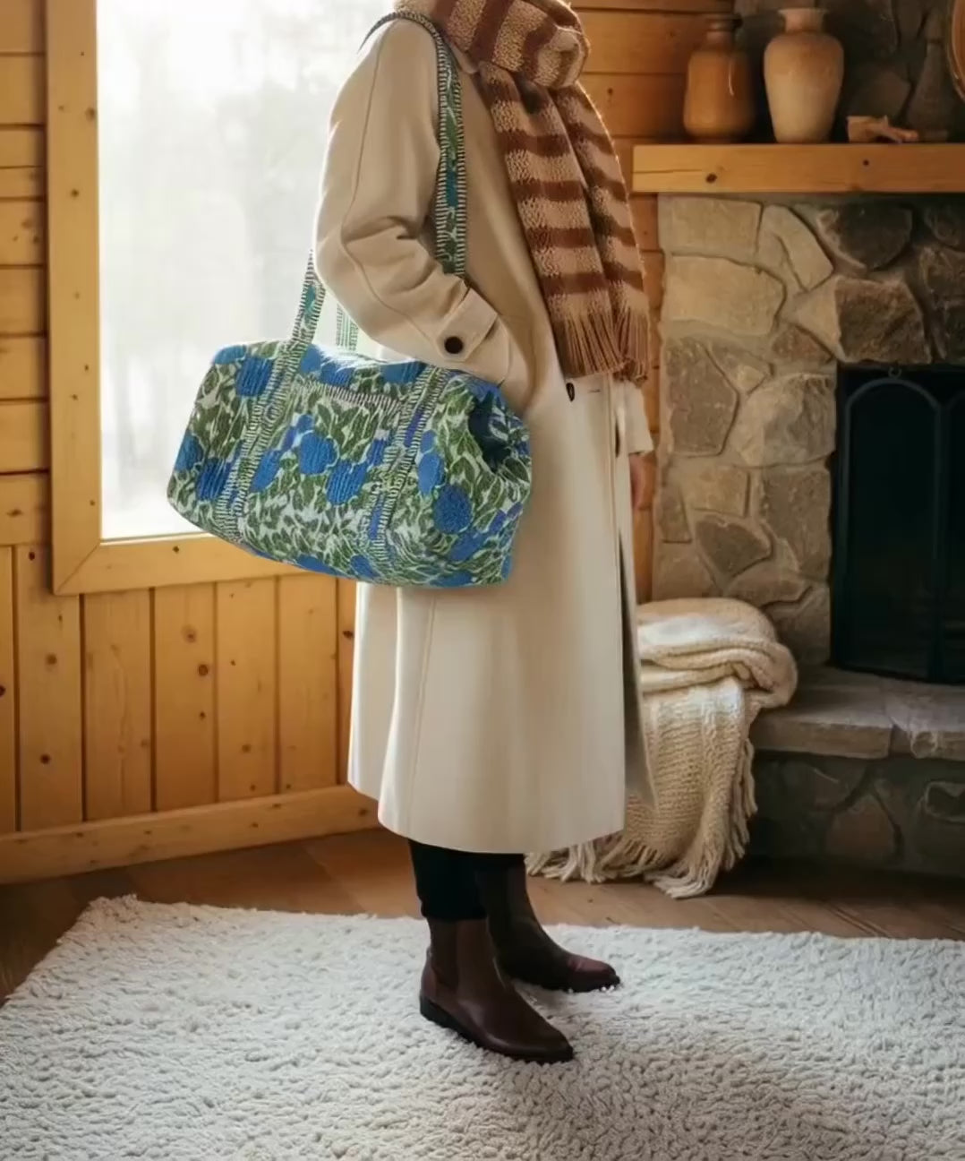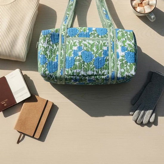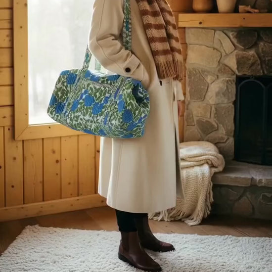 Designed with both form and function in mind, Indria handmade patchwork duffle bag ,features a spacious main compartment, sturdy carry handles and super soft fabric. Whether you’re heading for a countryside escape, a city break, or a quick overnight trip, The Indria provides ample space for your essentials while maintaining a chic, minimalist silhouette.